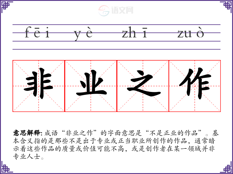成语“非业之作”的字面意思是“不是正业的作品”。基本含义指的是那些不是出于专业或正当职业所创作的作品,通常暗示着这些作品的质量或价值可能不高,或是创作者在某一领域并非专业人士。