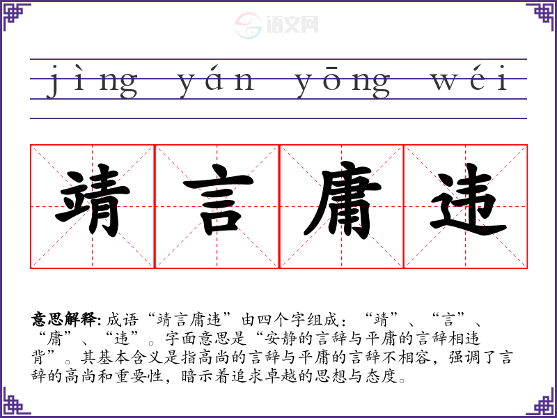 成语“靖言庸违”由四个字组成:“靖”、“言”、“庸”、“违”。字面意思是“安静的言辞与平庸的言辞相违背”。其基本含义是指高尚的言辞与平庸的言辞不相容,强调了言辞的高尚和重要性,暗示着追求卓越的思想与态度。