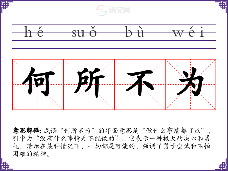 成语“何所不为”的字面意思是“做什么事情都可以”,引申为“没有什么事情是不能做的”。它表示一种极大的决心和勇气,暗示在某种情况下,一切都是可能的,强调了勇于尝试和不怕困难的精神。