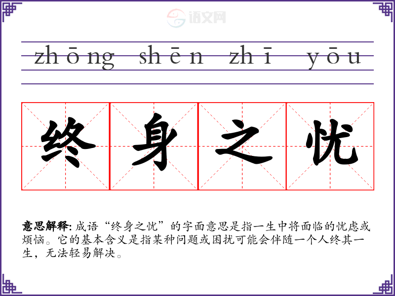 “终身之忧”并没有明确的历史典故或文献出处,但其构成的字词在古代文献中常有出现。可以理解为一个人所面临的长久性的问题,可能与生活、家庭、事业等各个方面相关,强调了忧虑的持久性和严重性。