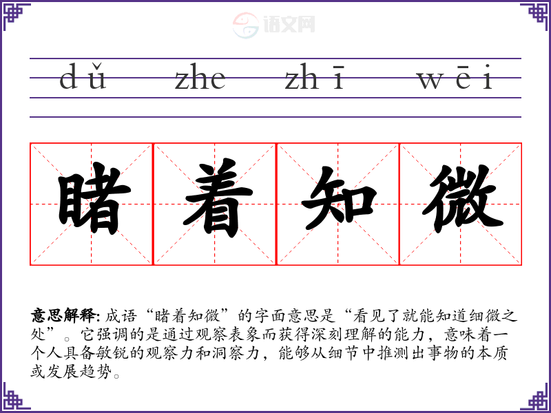 成语“睹着知微”的字面意思是“看见了就能知道细微之处”。它强调的是通过观察表象而获得深刻理解的能力,意味着一个人具备敏锐的观察力和洞察力,能够从细节中推测出事物的本质或发展趋势。