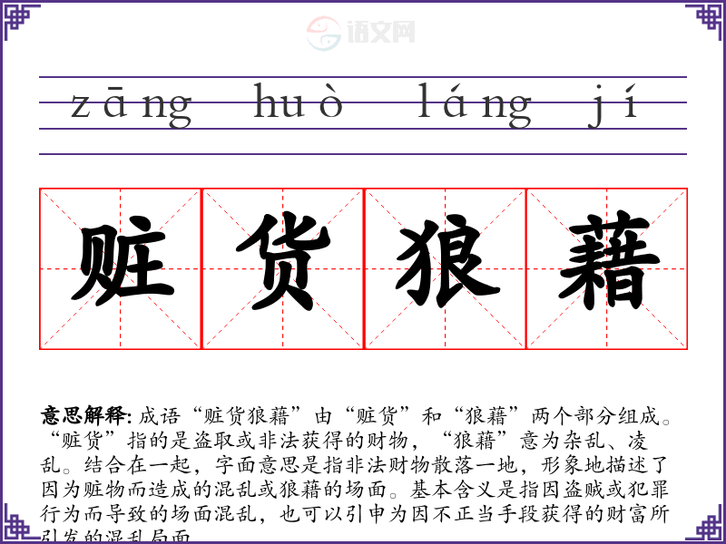 成语“赃货狼藉”由“赃货”和“狼藉”两个部分组成。“赃货”指的是盗取或非法获得的财物,“狼藉”意为杂乱、凌乱。结合在一起,字面意思是指非法财物散落一地,形象地描述了因为赃物而造成的混乱或狼藉的场面。基本含义是指因盗贼或犯罪行为而导致的场面混乱,也可以引申为因不正当手段获得的财富所引发的混乱局面。