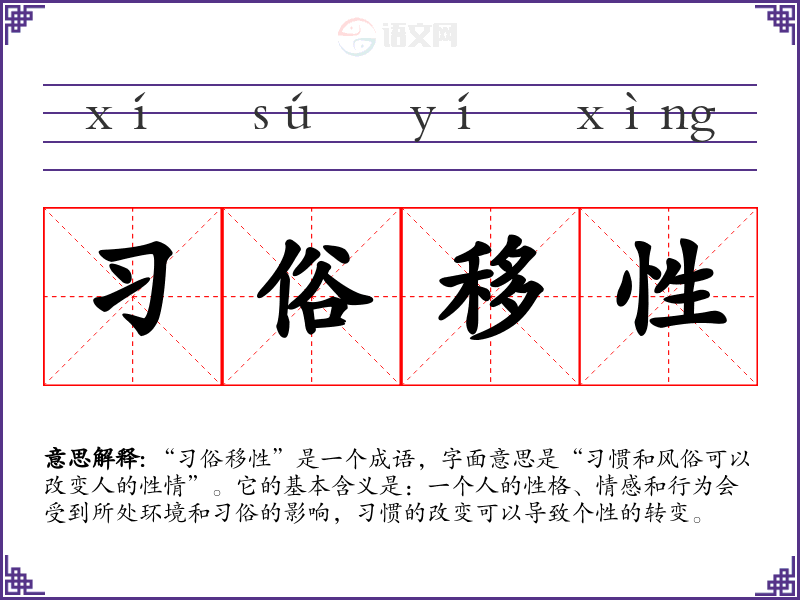 通过对“俗移性”的学,我认识到环境对个人成长的重要性。它提醒我在与他人的交往中,尊重和理解不同的文化*俗,从而促进自我和他人的发展。这一成语在日常交流和思维表达中能够帮助我更好地理解人际关系和文化适应的重要性。