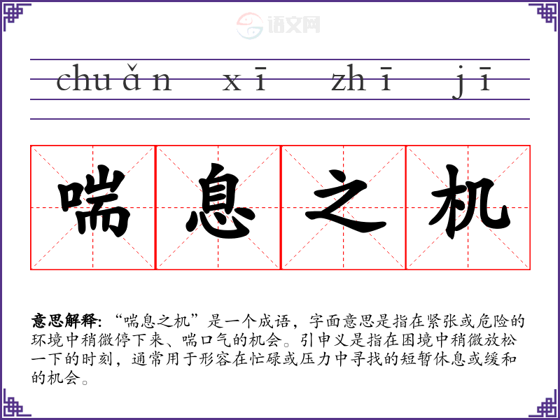 “喘息之机”是一个成语,字面意思是指在紧张或危险的环境中稍微停下来、喘口气的机会。引申义是指在困境中稍微放松一下的时刻,通常用于形容在忙碌或压力中寻找的短暂休息或缓和的机会。