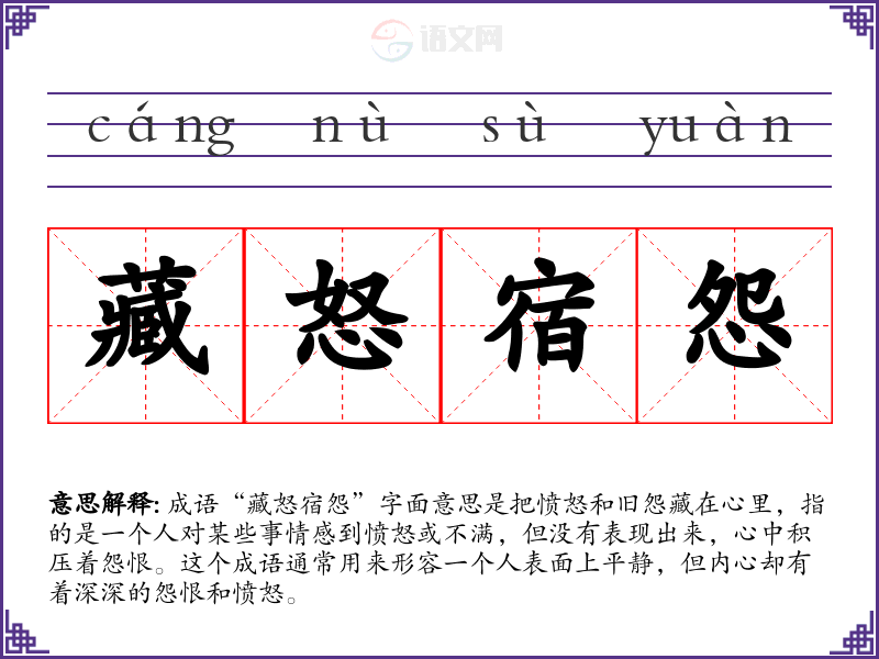 - 这些成语都表达了内心的不满或怨恨,但“藏怒宿怨”更强调对愤怒和怨恨的隐藏和积压。