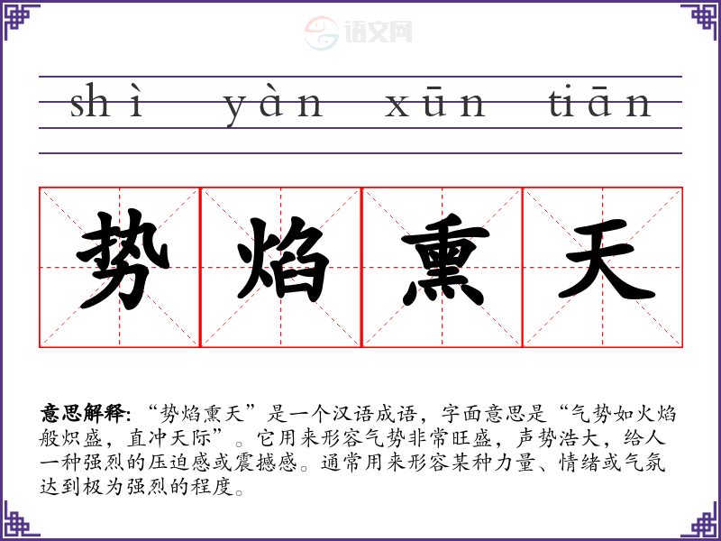 在文化中,气势被视为一种重要的表达方式,尤其在政治、军事等领域。成语“势焰熏天”强调了力量的强大和影响的深远,适合用来描述领导者、英雄或重大。现代社会中,随着媒体和信息传播的迅速变化,该成语在描述社会**、公众活动时依然适用。