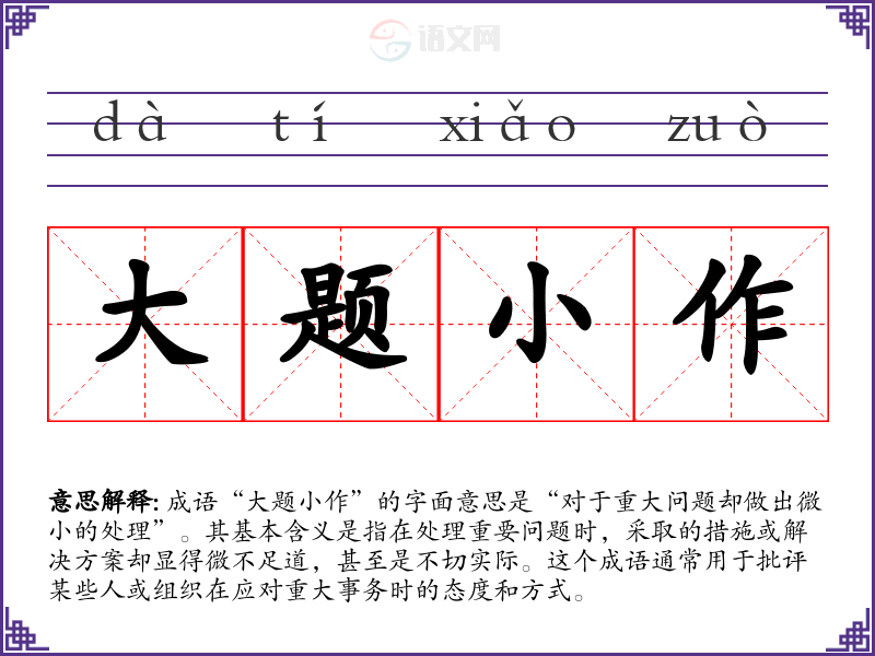 成语“大题小作”的字面意思是“对于重大问题却做出微小的处理”。其基本含义是指在处理重要问题时,采取的措施或解决方案却显得微不足道,甚至是不切实际。这个成语通常用于批评某些人或组织在应对重大事务时的态度和方式。