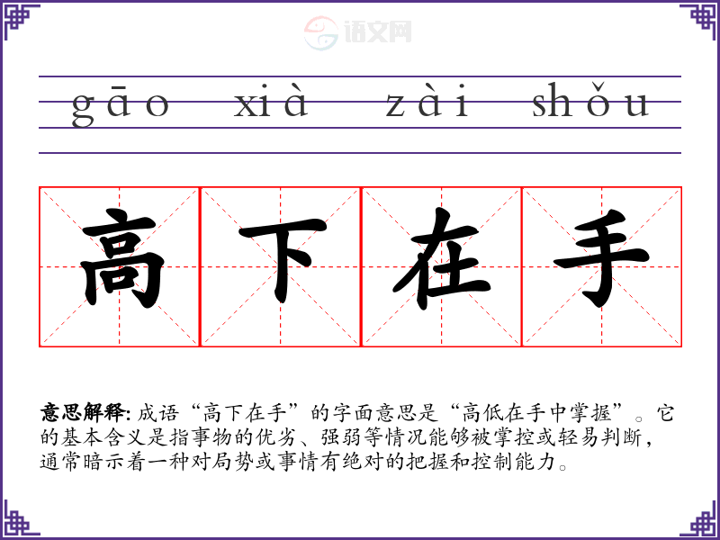 成语“高下在手”的字面意思是“高低在手中掌握”。它的基本含义是指事物的优劣、强弱等情况能够被掌控或轻易判断,通常暗示着一种对局势或事情有绝对的把握和控制能力。