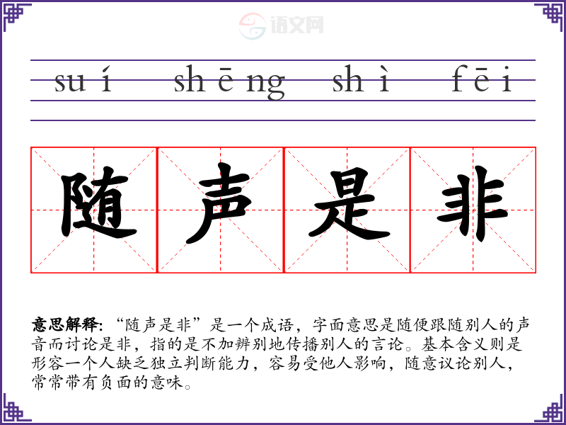 “随声是非”是一个成语,字面意思是随便跟随别人的声音而讨论是非,指的是不加辨别地传播别人的言论。基本含义则是形容一个人缺乏独立判断能力,容易受他人影响,随意议论别人,常常带有负面的意味。
