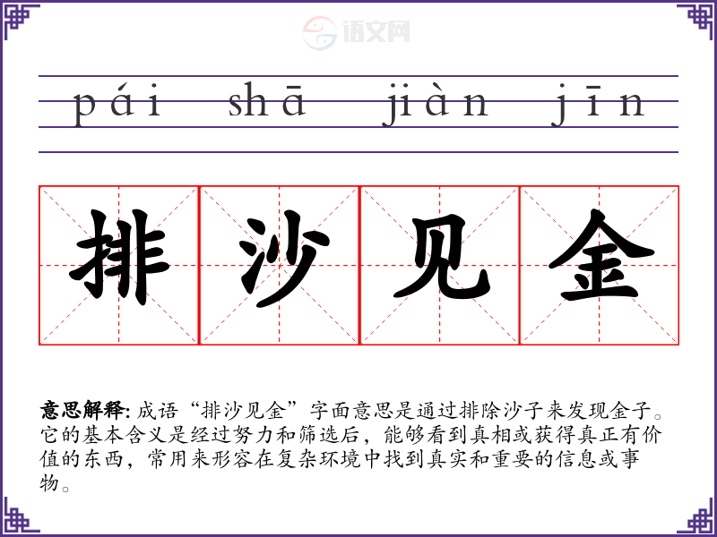 通过对“排沙见金”的学,我深刻认识到在生活和学中,面对复杂和混乱的信息时,需要耐心和努力去筛选和分析,才能找到真正有价值的东西。这不仅加深了我的成语理解,也提升了我在表达和沟通中的能力。