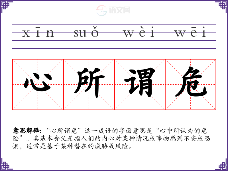 “心所谓危”这一成语的字面意思是“心中所认为的危险”。其基本含义是指人们的内心对某种情况或事物感到不安或恐惧,通常是基于某种潜在的威胁或风险。