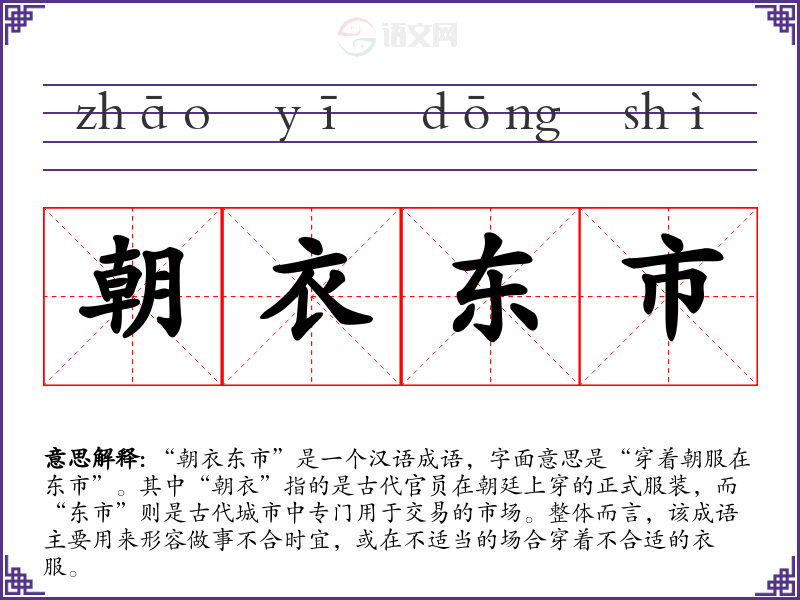 “朝衣东市”是一个汉语成语,字面意思是“穿着朝服在东市”。其中“朝衣”指的是古代官员在朝廷上穿的正式服装,而“东市”则是古代城市中专门用于交易的市场。整体而言,该成语主要用来形容做事不合时宜,或在不适当的场合穿着不合适的衣服。