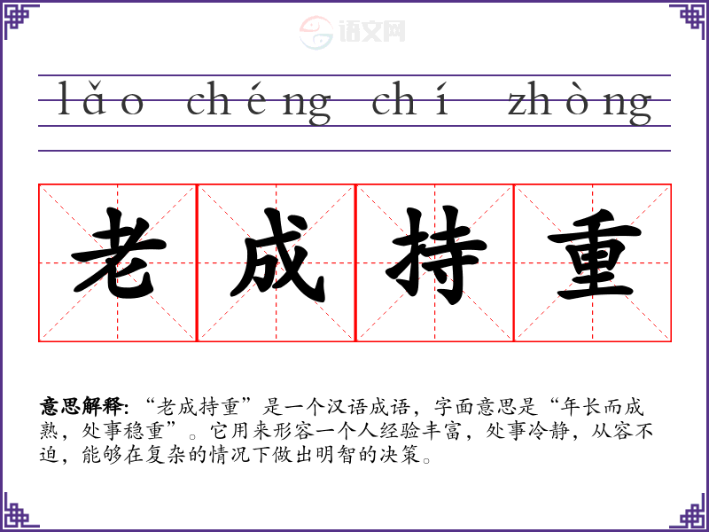 “老成持重”是一个汉语成语,字面意思是“年长而成熟,处事稳重”。它用来形容一个人经验丰富,处事冷静,从容不迫,能够在复杂的情况下做出明智的决策。