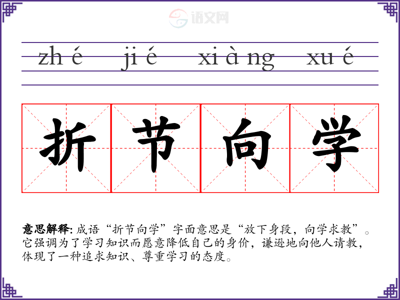 成语“折节向学”字面意思是“放下身段,向学求教”。它强调为了学知识而愿意降低自己的身价,谦逊地向他人请教,体现了一种追求知识、尊重学的态度。