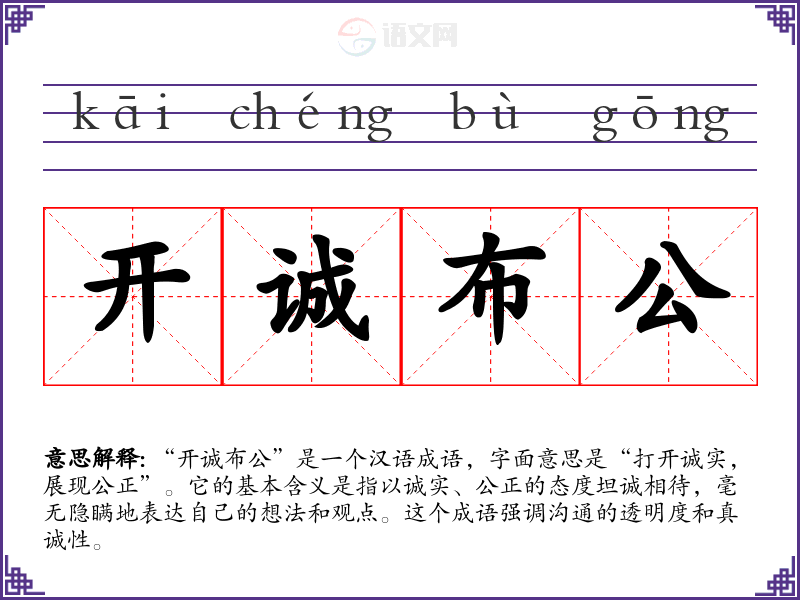 “开诚布公”是一个汉语成语,字面意思是“打开诚实,展现公正”。它的基本含义是指以诚实、公正的态度坦诚相待,毫无隐瞒地表达自己的想法和观点。这个成语强调沟通的透明度和真诚性。