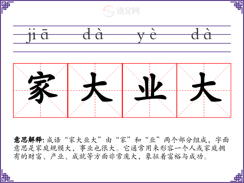 成语“家大业大”由“家”和“业”两个部分组成,字面意思是家庭规模大,事业也很大。它通常用来形容一个人或家庭拥有的财富、产业、成就等方面非常庞大,象征着富裕与成功。