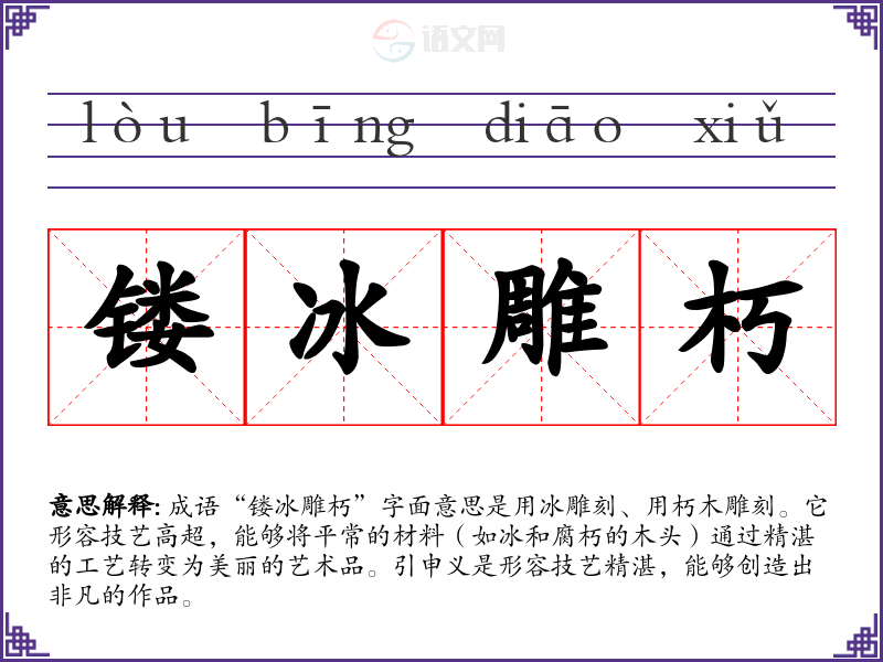 成语“镂冰雕朽”字面意思是用冰雕刻、用朽木雕刻。它形容技艺高超,能够将平常的材料(如冰和腐朽的木头)通过精湛的工艺转变为美丽的艺术品。引申义是形容技艺精湛,能够创造出非凡的作品。