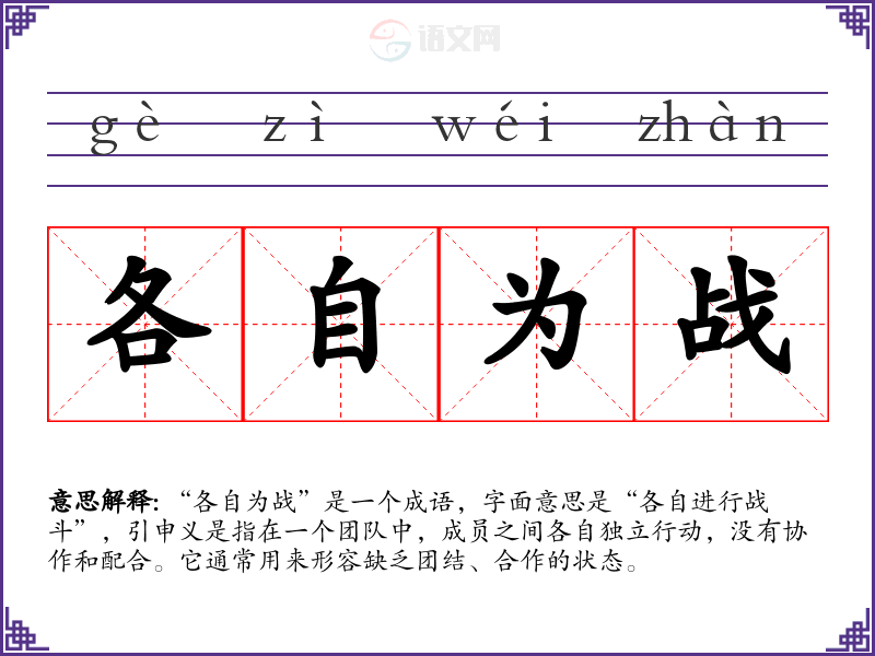 “各自为战”是一个成语,字面意思是“各自进行战斗”,引申义是指在一个团队中,成员之间各自独立行动,没有协作和配合。它通常用来形容缺乏团结、合作的状态。