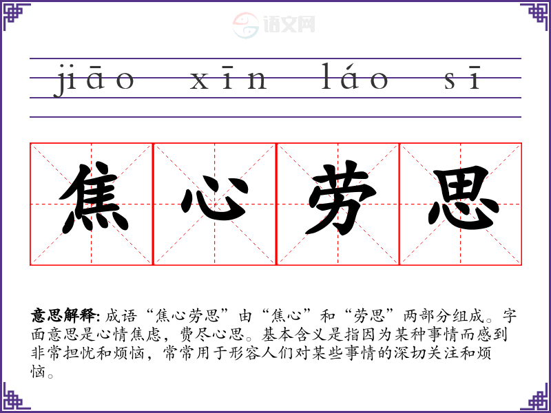 成语“焦心劳思”由“焦心”和“劳思”两部分组成。字面意思是心情焦虑,费尽心思。基本含义是指因为某种事情而感到非常担忧和烦恼,常常用于形容人们对某些事情的深切关注和烦恼。