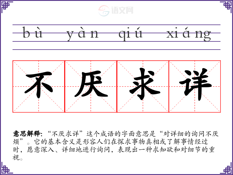 “不厌求详”这个成语的字面意思是“对详细的询问不厌烦”。它的基本含义是形容人们在探求事物真相或了解事情经过时,愿意深入、详细地进行询问,表现出一种求知欲和对细节的重视。