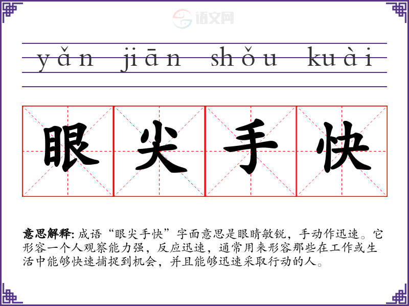 成语“眼尖手快”字面意思是眼睛敏锐,手动作迅速。它形容一个人观察能力强,反应迅速,通常用来形容那些在工作或生活中能够快速捕捉到机会,并且能够迅速采取行动的人。