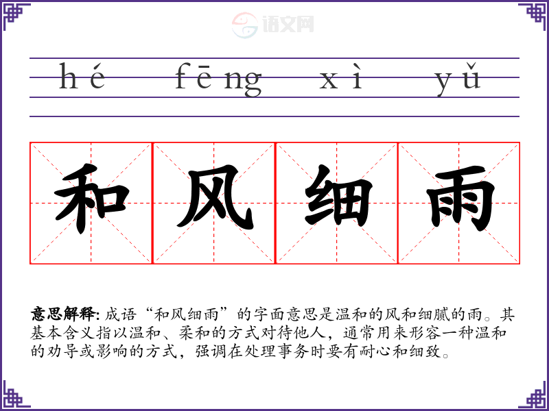 成语“和风细雨”的字面意思是温和的风和细腻的雨。其基本含义指以温和、柔和的方式对待他人,通常用来形容一种温和的劝导或影响的方式,强调在处理事务时要有耐心和细致。