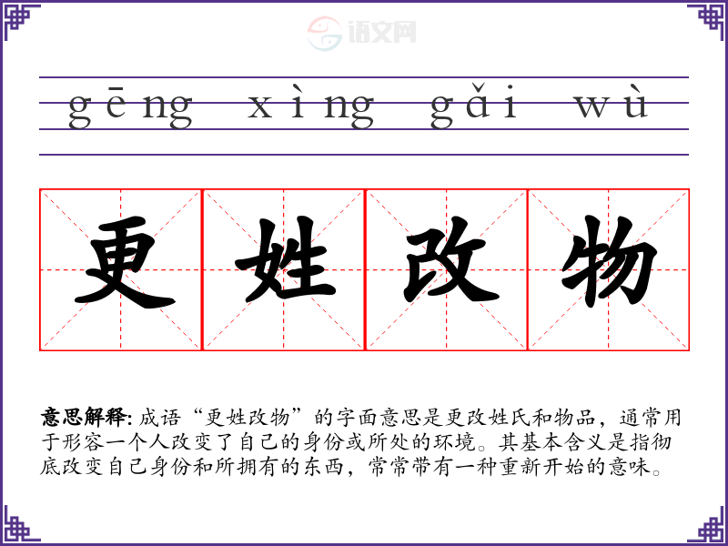 成语“更姓改物”的字面意思是更改姓氏和物品,通常用于形容一个人改变了自己的身份或所处的环境。其基本含义是指彻底改变自己身份和所拥有的东西,常常带有一种重新开始的意味。
