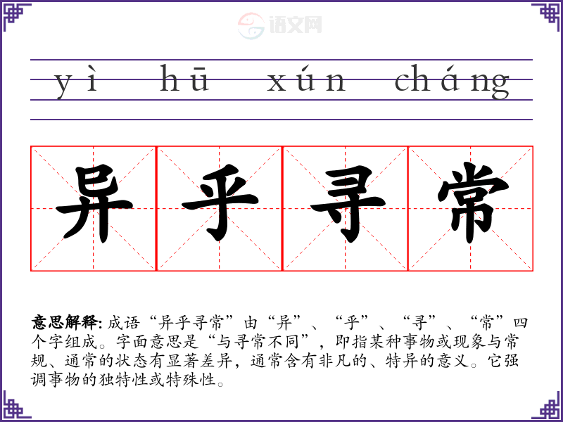 成语“异乎寻常”由“异”、“乎”、“寻”、“常”四个字组成。字面意思是“与寻常不同”,即指某种事物或现象与常规、通常的状态有显著差异,通常含有非凡的、特异的意义。它强调事物的独特性或特殊性。