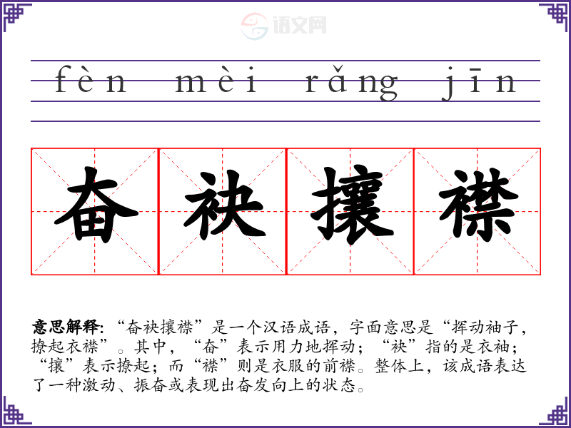 “奋袂攘襟”是一个汉语成语,字面意思是“挥动袖子,撩起衣襟”。其中,“奋”表示用力地挥动;“袂”指的是衣袖;“攘”表示撩起;而“襟”则是衣服的前襟。整体上,该成语表达了一种激动、振奋或表现出奋发向上的状态。