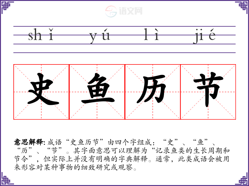 成语“史鱼历节”由四个字组成:“史”、“鱼”、“历”、“节”。其字面意思可以理解为“记录鱼类的生长周期和节令”,但实际上并没有明确的字典解释。通常,此类成语会被用来形容对某种事物的细致研究或观察。