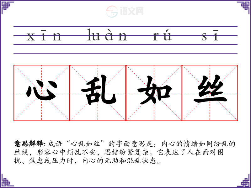 成语“心乱如丝”的字面意思是:内心的情绪如同纷乱的丝线,形容心中烦乱不安,思绪纷繁复杂。它表达了人在面对困扰、焦虑或压力时,内心的无助和混乱状态。