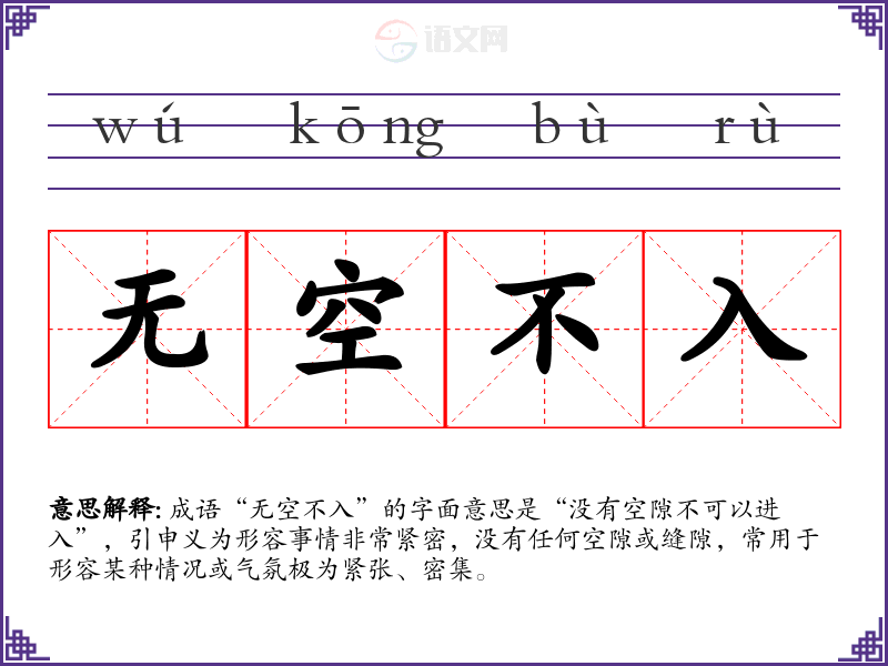 成语“无空不入”的字面意思是“没有空隙不可以进入”,引申义为形容事情非常紧密,没有任何空隙或缝隙,常用于形容某种情况或气氛极为紧张、密集。