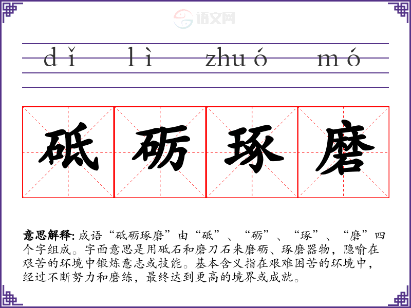 成语“砥砺琢磨”由“砥”、“砺”、“琢”、“磨”四个字组成。字面意思是用砥石和磨刀石来磨砺、琢磨器物,隐喻在艰苦的环境中锻炼意志或技能。基本含义指在艰难困苦的环境中,经过不断努力和磨练,最终达到更高的境界或成就。