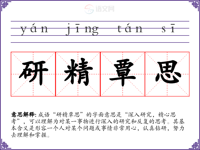 成语“研精覃思”的字面意思是“深入研究,精心思考”,可以理解为对某一事物进行深入的研究和反复的思考。其基本含义是形容一个人对某个问题或事情非常用心,认真钻研,努力去理解和掌握。