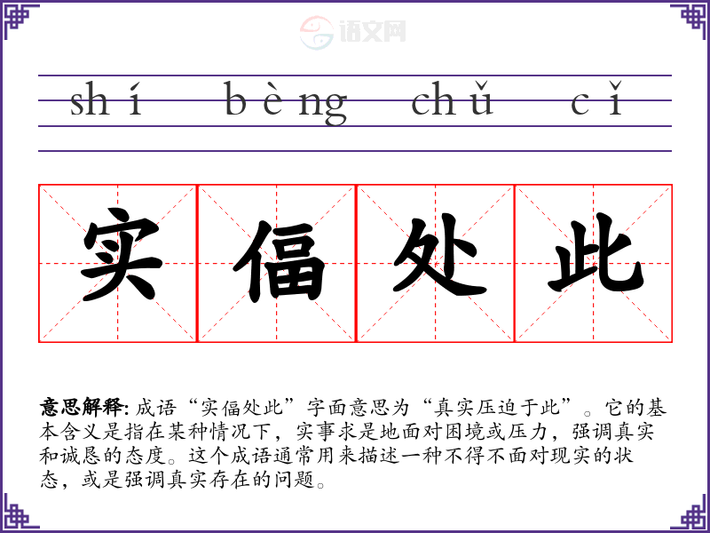 在不同的语境中,“实偪处此”可以用来表达对现实的无奈和对真相的接受。在文学作品中,作者可以用这个成语来描绘角色面临的困境;在日常对话中,它可以用来描述某人的处境,如面对工作压力、生活挑战等;在演讲时,演讲者也可以用它来呼吁人们面对现实,积极应对。