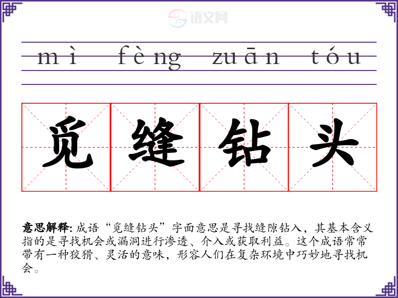 成语“觅缝钻头”字面意思是寻找缝隙钻入,其基本含义指的是寻找机会或漏洞进行渗透、介入或获取利益。这个成语常常带有一种狡猾、灵活的意味,形容人们在复杂环境中巧妙地寻找机会。
