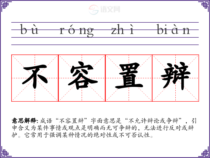 成语“不容置辩”字面意思是“不允许辩论或争辩”,引申含义为某件事情或观点是明确而无可争辩的,无法进行反对或辩护。它常用于强调某种情况的绝对性或不可否认性。