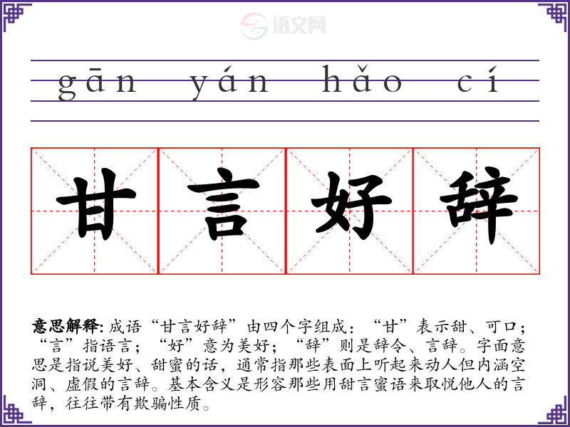 成语“甘言好辞”由四个字组成:“甘”表示甜、可口;“言”指语言;“好”意为美好;“辞”则是辞令、言辞。字面意思是指说美好、甜蜜的话,通常指那些表面上听起来动人但内涵空洞、虚假的言辞。基本含义是形容那些用甜言蜜语来取悦他人的言辞,往往带有欺骗性质。