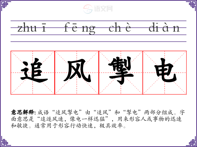 成语“追风掣电”由“追风”和“掣电”两部分组成。字面意思是“追逐风速,像电一样迅猛”,用来形容人或事物的迅速和敏捷。通常用于形容行动快速,极具效率。