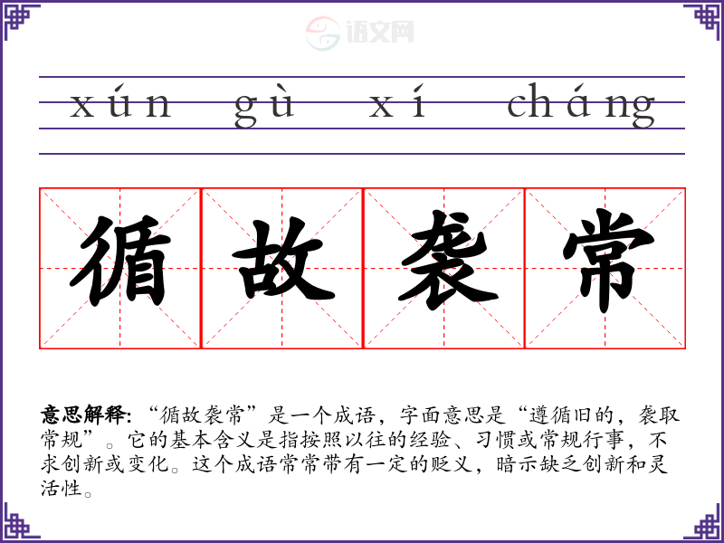“循故袭常”是一个成语,字面意思是“遵循旧的,袭取常规”。它的基本含义是指按照以往的经验、*惯或常规行事,不求创新或变化。这个成语常常带有一定的贬义,暗示缺乏创新和灵活性。