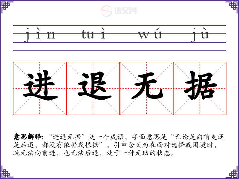 “进退无据”是一个成语,字面意思是“无论是向前走还是后退,都没有依据或根据”。引申含义为在面对选择或困境时,既无法向前进,也无法后退,处于一种无助的状态。