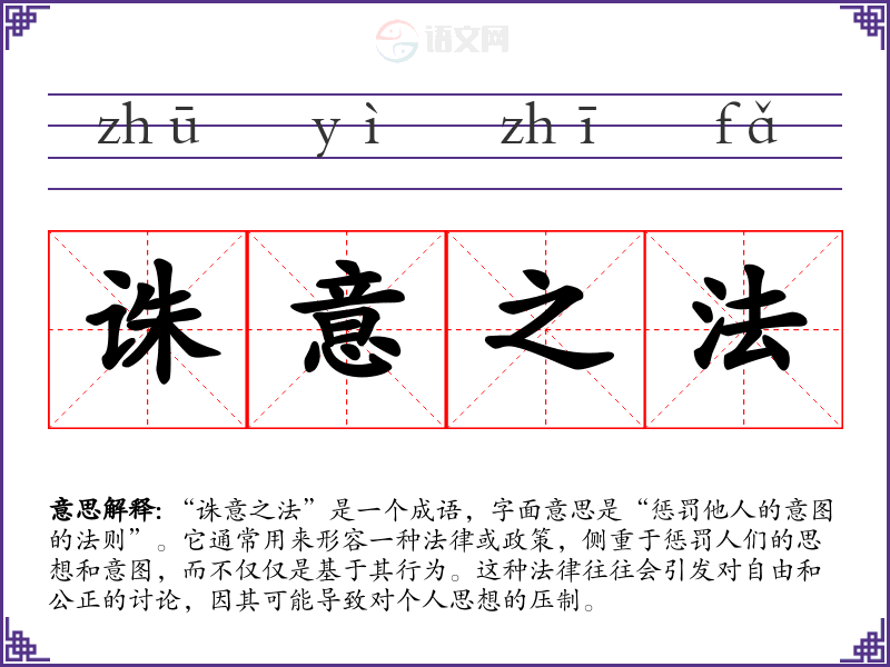 “诛意之法”是一个成语,字面意思是“惩罚他人的意图的法则”。它通常用来形容一种法律或政策,侧重于惩罚人们的思想和意图,而不仅仅是基于其行为。这种法律往往会引发对自由和公正的讨论,因其可能导致对个人思想的压制。