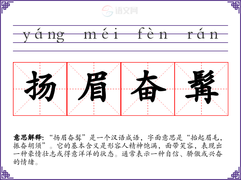 “扬眉奋髯”是一个汉语成语,字面意思是“抬起眉毛,振奋胡须”。它的基本含义是形容人精神饱满,面带笑容,表现出一种豪情壮志或得意洋洋的状态。通常表示一种自信、骄傲或兴奋的情绪。