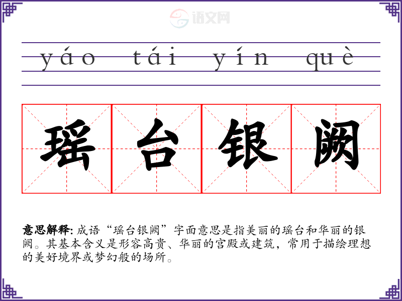 成语“瑶台银阙”字面意思是指美丽的瑶台和华丽的银阙。其基本含义是形容高贵、华丽的宫殿或建筑,常用于描绘理想的美好境界或梦幻般的场所。