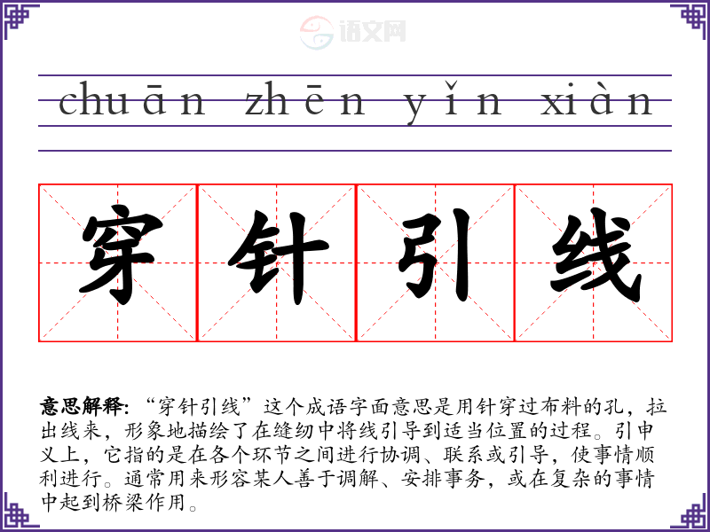“穿针引线”这个成语字面意思是用针穿过布料的孔,拉出线来,形象地描绘了在缝纫中将线引导到适当位置的过程。引申义上,它指的是在各个环节之间进行协调、联系或引导,使事情顺利进行。通常用来形容某人善于调解、安排事务,或在复杂的事情中起到桥梁作用。