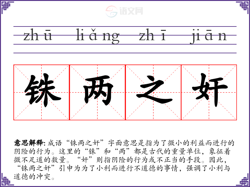 成语“铢两之奸”字面意思是指为了微小的利益而进行的阴险的行为。这里的“铢”和“两”都是古代的重量单位,象征着微不足道的数量。“奸”则指阴险的行为或不正当的手段。因此,“铢两之奸”引申为为了小利而进行不道德的事情,强调了小利与道德的冲突。