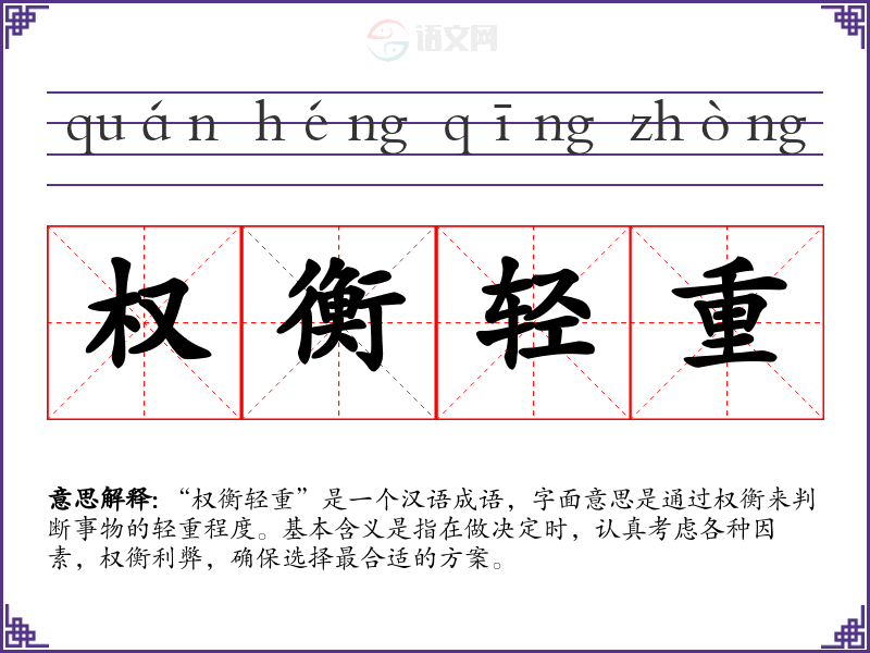 “权衡轻重”是一个汉语成语,字面意思是通过权衡来判断事物的轻重程度。基本含义是指在做决定时,认真考虑各种因素,权衡利弊,确保选择最合适的方案。