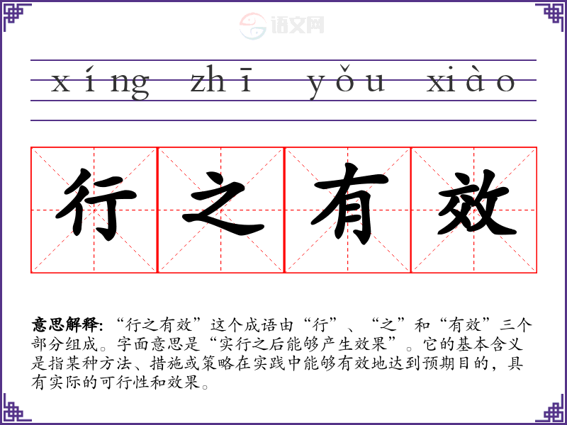 “行之有效”这个成语由“行”、“之”和“有效”三个部分组成。字面意思是“实行之后能够产生效果”。它的基本含义是指某种方法、措施或策略在实践中能够有效地达到预期目的,具有实际的可行性和效果。