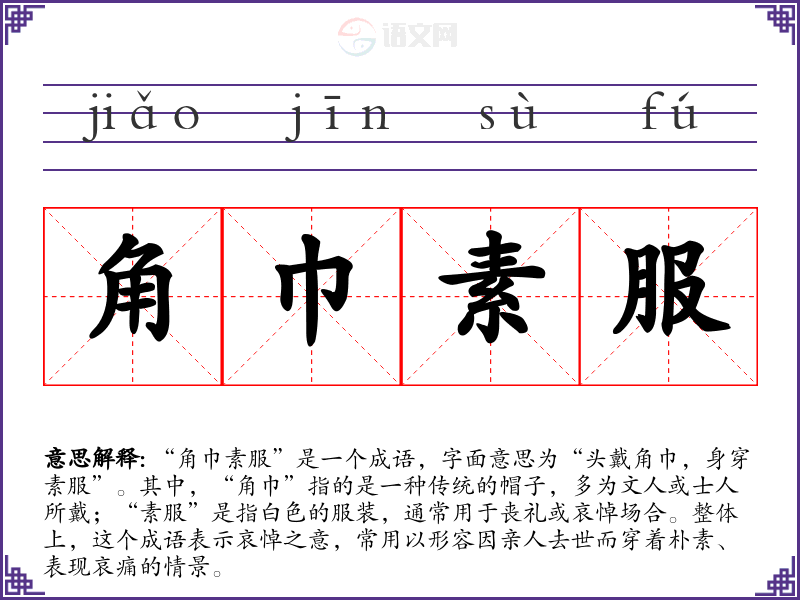 “角巾素服”是一个成语,字面意思为“头戴角巾,身穿素服”。其中,“角巾”指的是一种传统的帽子,多为文人或士人所戴;“素服”是指白色的服装,通常用于丧礼或哀悼场合。整体上,这个成语表示哀悼之意,常用以形容因亲人去世而穿着朴素、表现哀痛的情景。