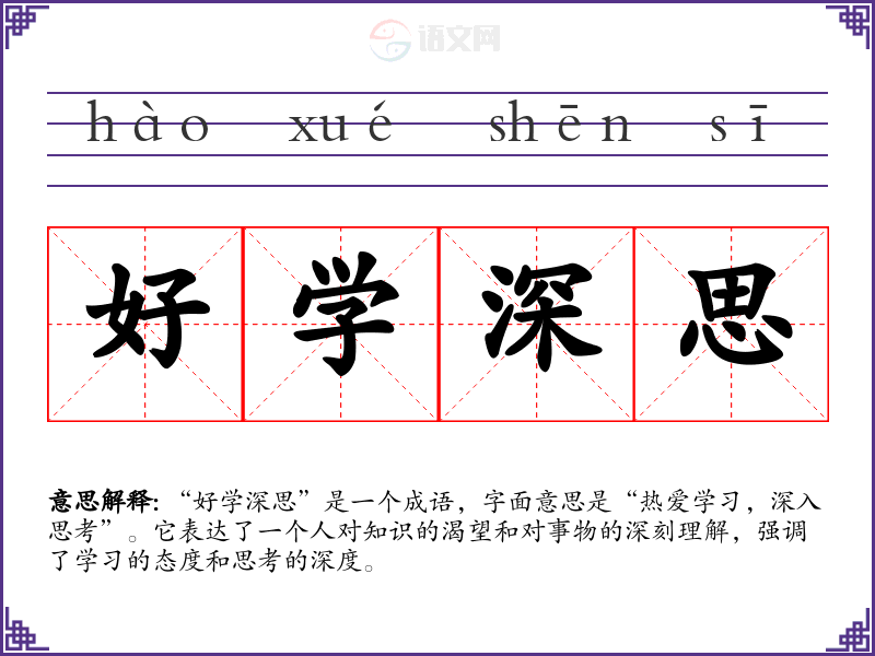 “好学深思”是一个成语,字面意思是“热爱学,深入思考”。它表达了一个人对知识的渴望和对事物的深刻理解,强调了学的态度和思考的深度。